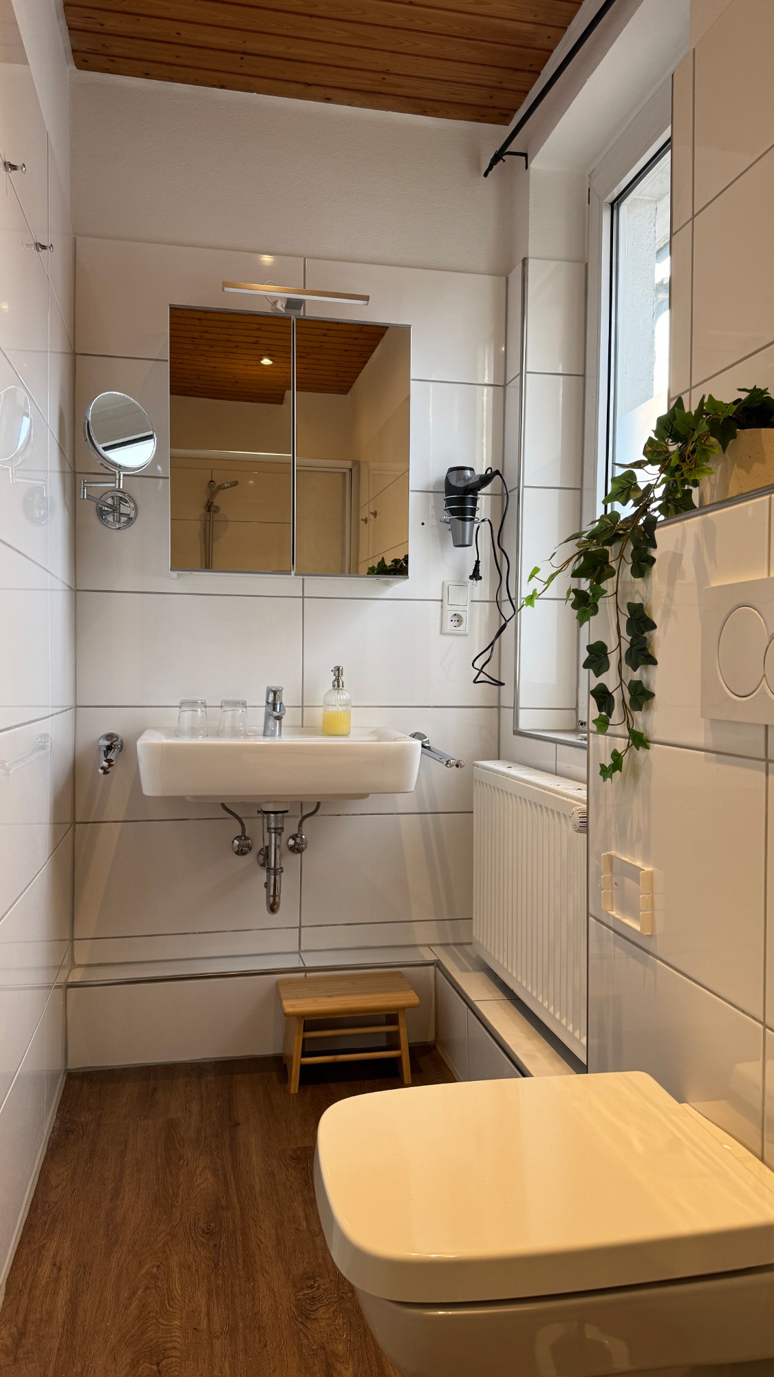 - Badezimmer mit Handtüchern, Bademänteln, Schminkspiegel, Fön, Dusche und WC